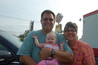 We were able to meet Nana and Papa L. today (Sunday) at Indiana Lake. We toured the lake and found out that it was pretty big and relatively nice. We had dinner, went to the beach, and ate some ice cream. Scott and I couldn't wait for them to see Elli....it has been at least 3 weeks since they had seen her last. Lately, she's been so much more aware and so much fun that we couldn't wait for them to see the changes in her. Unfortunately, she choose to be relatively cranky....they did get to see some smiles. As luck would have it, she was happier than ever as soon as we got her home and ready for bed....figures....she always does that to us!